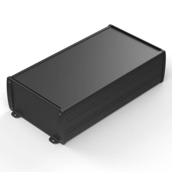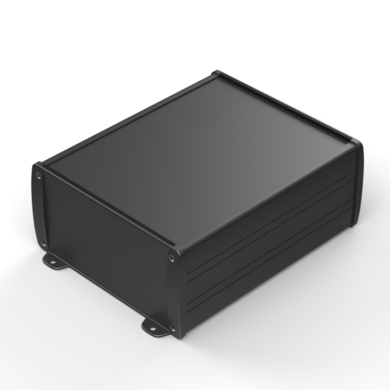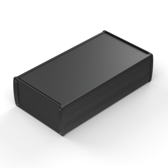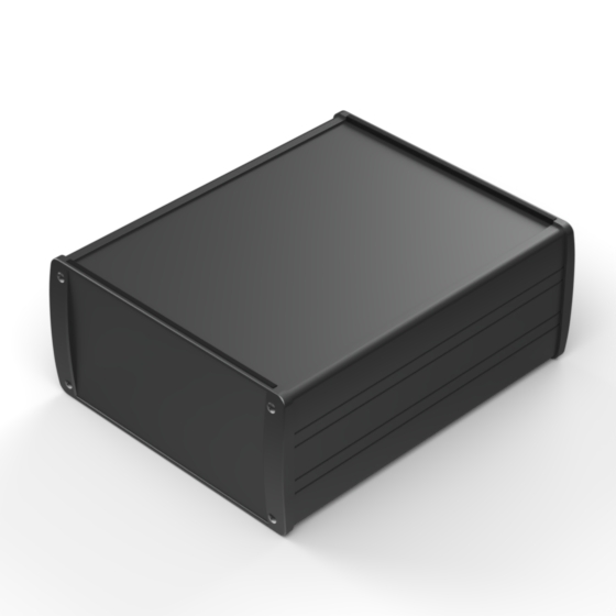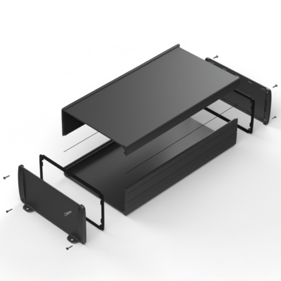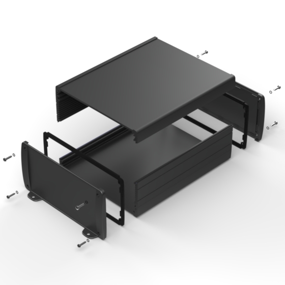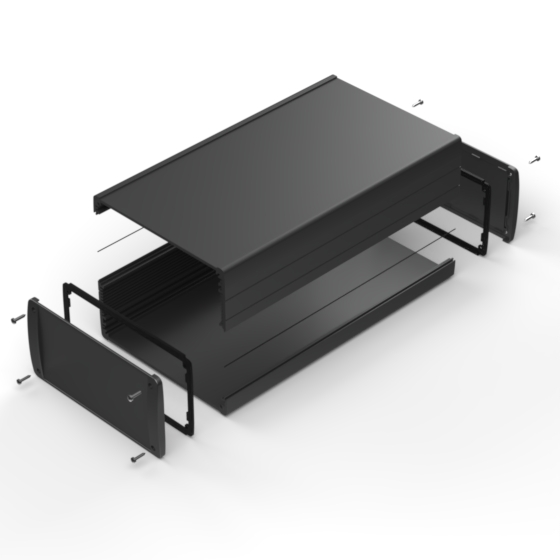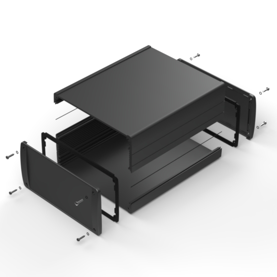 Profilgehäuse aus eloxiertem Aluminium mit oberflächiger Pulverbeschichtung. Zwei Metall- Abschlußdeckel, Dichtung-Sets für IP-65, integrierte Führungsrippen für PCB und eingelassene Oberfläche zur Aufnahme einer Tastatur. Die Modelle mit „E“ haben Metall-Frontlaschen zur Wandbefestigung. Montage mit acht Schrauben.