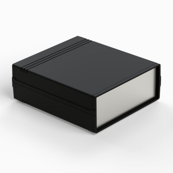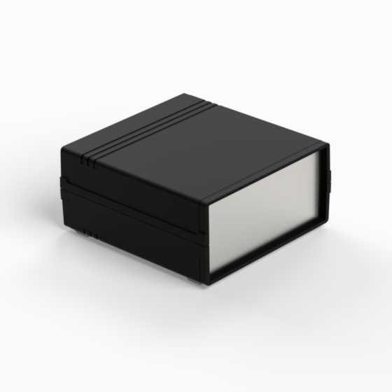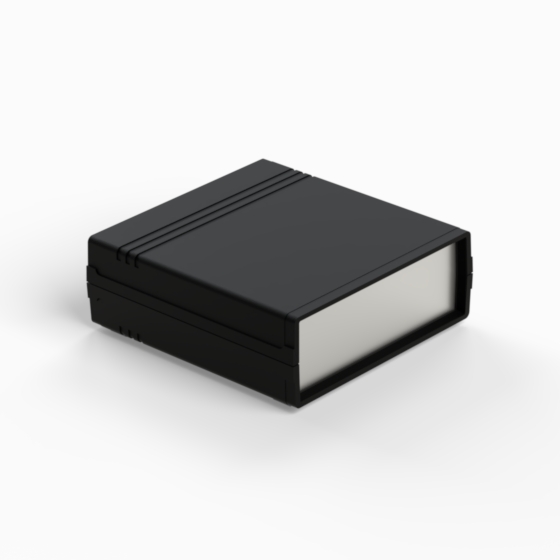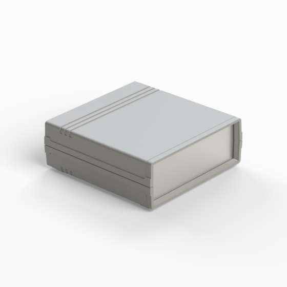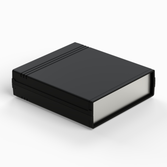 Kunststoffgehäuse mit zwei 1 mm starken Aluminiumdeckplatten. Jede Hälfte hat integrierte Führungen und Montagepfeiler für PCB. Matte Oberfläche. Montage mit nur 2 Schrauben. Front- und Rückplatte auch in hellgrauen ABS (Farbenkod .13) erhältlich. Version mit Plastikplatte: 011P, 012P, 022P, 222P, 223P, 233P.