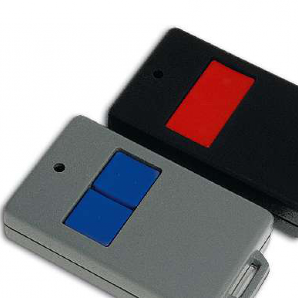 Kunststoffgehäuse mit abgerundeten Ecken und mit eins oder zwei Drucktasten. Der Gehäuseunterteil hat integrierten Montagepfeiler für PCB. Das Gehäuse hat zwei Metallkontakte für 12V-Batterien (Mod. AB12). Matte Oberfläche. Montage mit nur einer Schraube.