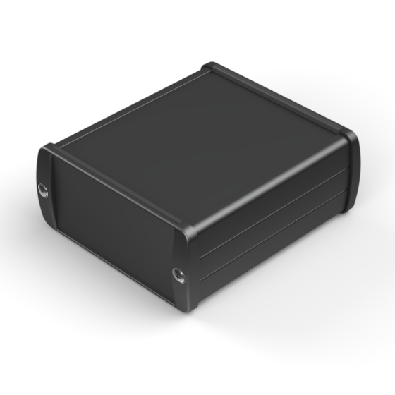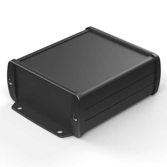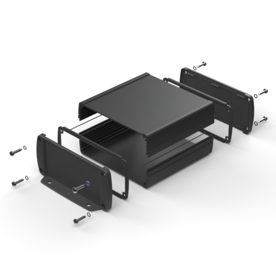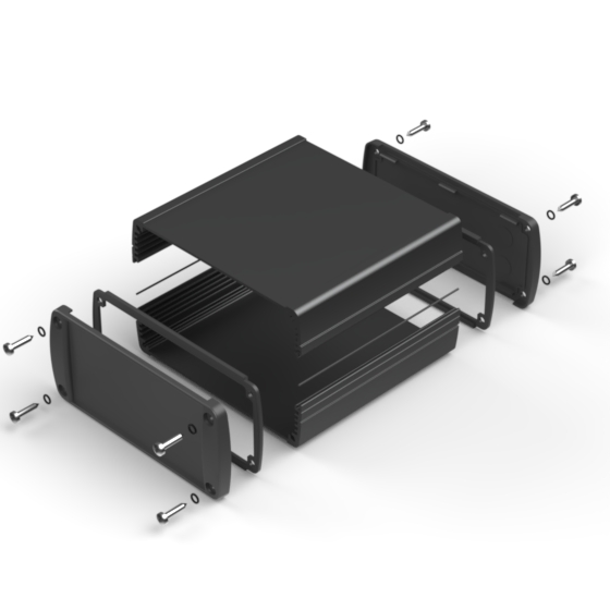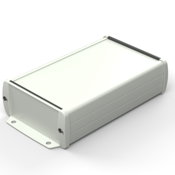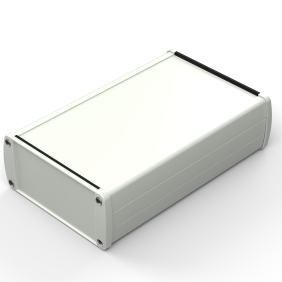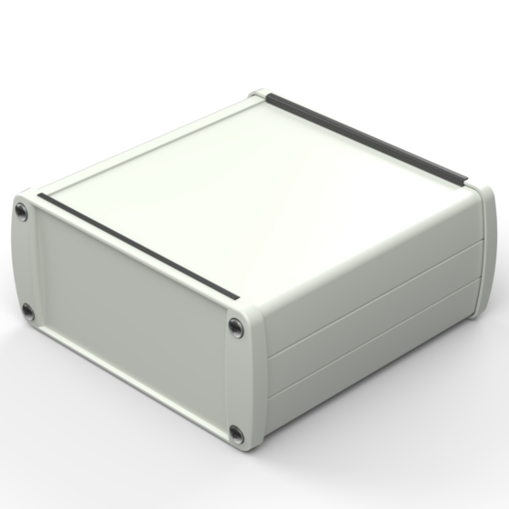 Extruded aluminium case with powder coating and two rubber sealing kits to protect against water and from dust (IP65) available in six different colours. Two metal front panels, internal slots for PCB’s and a recessed area for a keypad membrane. The models with “E” have mounting wall metal panels. Closing by four or eight screws.