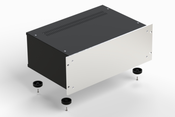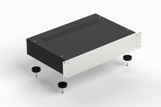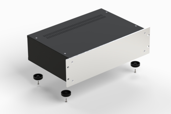 Série de coffrets au design moderne et finition professionnelle. Face avant en aluminium anodisé argenté, cotés et couvercles en acier inox noir. Trous d’aération à la partie supérieure. Faces mobiles même avec structure base fixe. ACCESSOIRES: châssis interne 175 mm x 435 (Mod. LEVEL) – Poignées plates en aluminium anodisé, argenté ou noir (Mod. FLAT RACK) – Poignées rondes en acier plastifié noir (Mod. ROUND RACK).