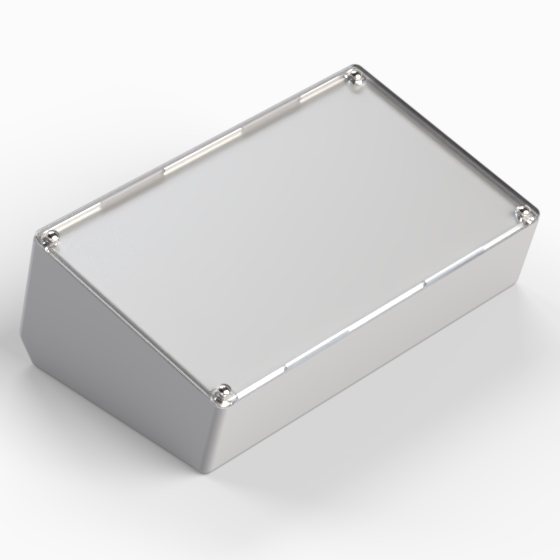 Contenitore in ABS dotato di pannello superiore in policarbonato trasparente inclinato di 15°, con pannello interno in alluminio anodizzato di spessore 1 mm. Pareti con superfici lucide all’interno delle quali sono presenti guide e punti di fissaggio per PCB. Chiusura a 4 viti.
